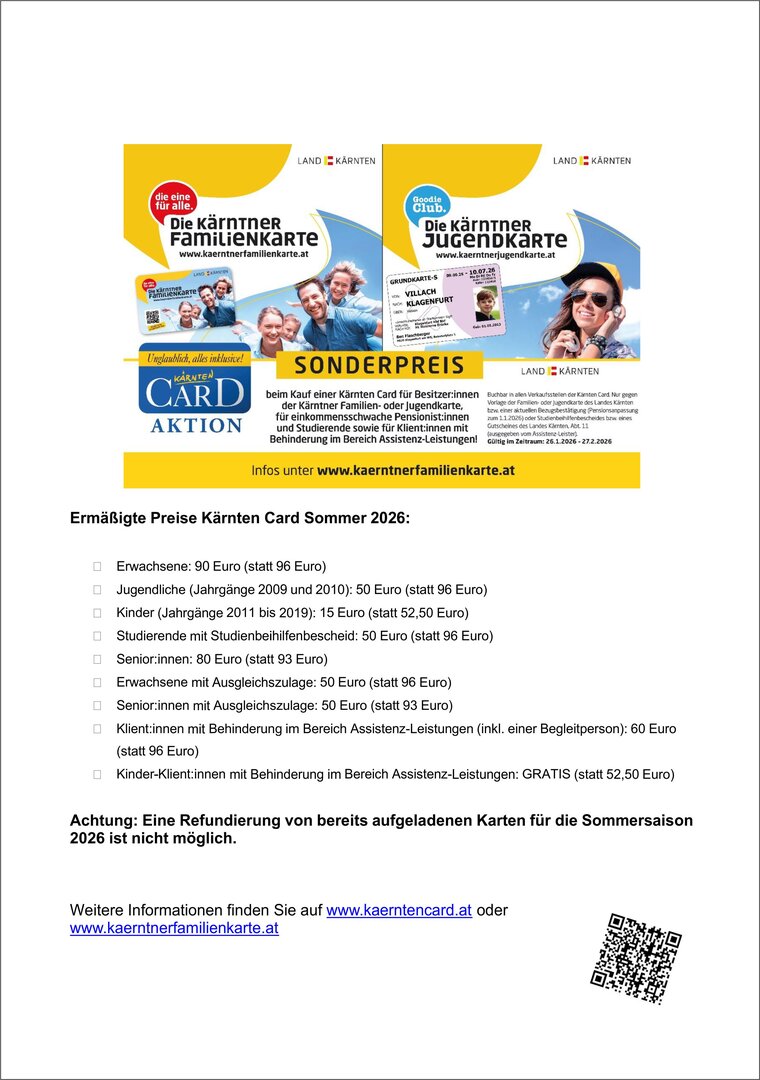 In der Zeit vom 26. Jänner bis 27. Februar 2026 können Besitzer der Kärntner Familienkarte (max. 2 Elternteile, Kinder, Großeltern), Kärntner Jugendkarte und auch Studierende, einkommensschwache Personen sowie Klient:innen mit Behinderung im Bereich Assistenz-Leistungen beim Kauf der Kärnten Card Saisonkarte 2026 ordentlich sparen!