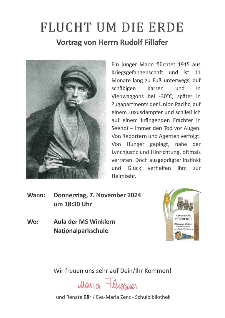 Vortrag Bücherei (in der Aula der MS Winklern Nationalparkschule): Flucht um die Erde